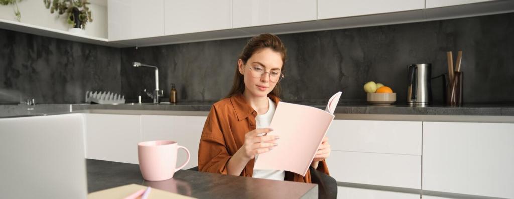 Schreibe, wie Morgenlicht an der Putzkante bricht, abends die Pendelleuchte die Tafel fasst, indirektes Licht die Kanten weichzeichnet. So entsteht Rhythmus im Kopf. Abonniere für Formulierungslisten.